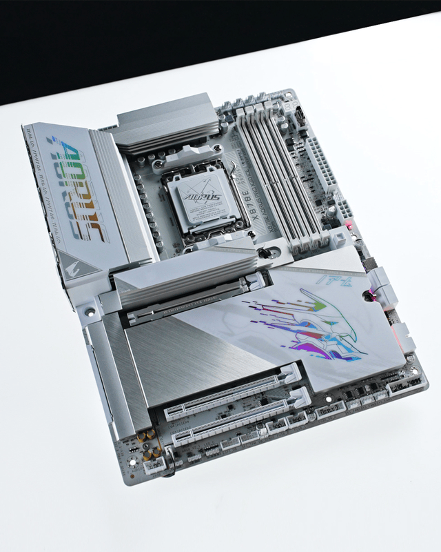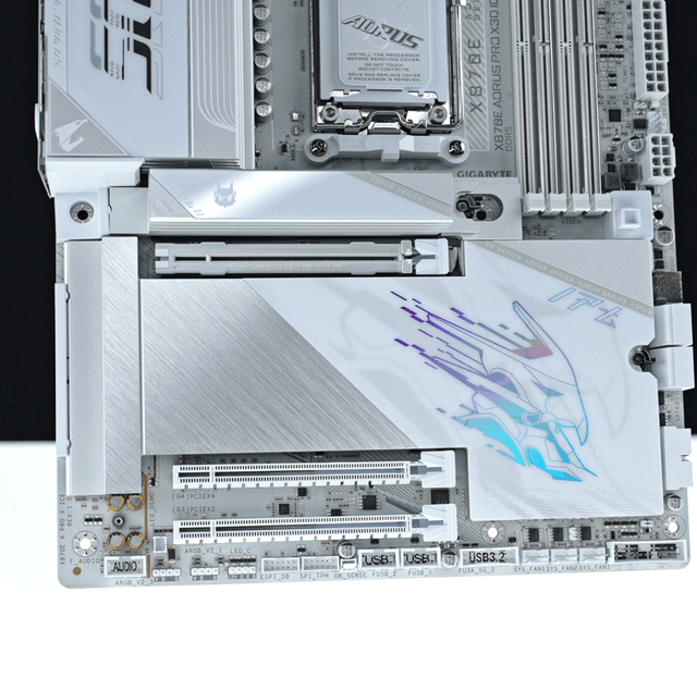 X870E AORUS PRO X3D ICE电竞冰雕绝对是主板届的颜值担当,通体雪白的散热装甲质感十足,银灰色的手绘拉丝纹理更是点睛之笔,整体看上去就像一件精雕细琢的艺术品,很好诠释了 “冰雕” 的美学内涵。特别是散热片上的AORUS标志和隐藏的RGB灯效,在装机点亮之后科技感直接拉满,放在机箱里绝对是颜值担当。